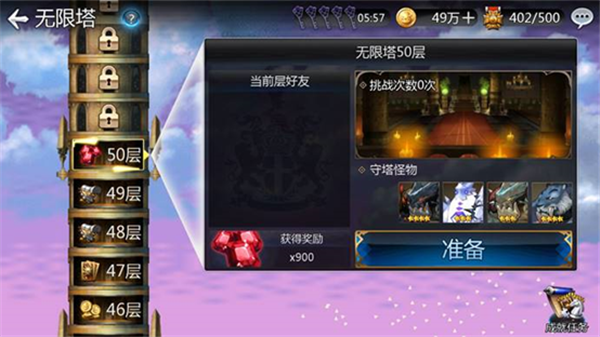 游戏独有的无限塔玩法,鼓励玩家尽力往更高层次冲刺。无尽塔共60层,可重复挑战,但只有第一次挑战时才能够获得奖励。每层获得金币、英雄卡牌、武器防具、荣誉等,属于玩家必须挑战的场景之一,每次挑战会消耗一个千层塔钥匙,每30分钟恢复一个钥匙。