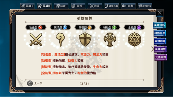 英雄属性分为攻击型、魔法型、防御型、辅助型、全能型五种属性。不同属性的英雄拥有不同方面的特长能力。