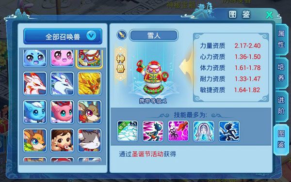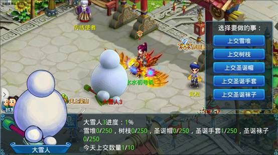 玩家们只要到应天府外的雪堆采集,即可采集到雪堆、树枝、圣诞帽等道具,上交到大雪人中,即可获得奖励,还可以与服务器中的其他水粉一起把光秃秃的雪人,精美打扮一番。其中奖励包括大雪块,凑满350个大雪块,玩家即可兑换活动限定神兽“雪人”