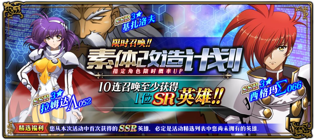 限时召唤[素体改造计划]开启,在SSR英雄中基扎洛夫、西格玛、拉姆达出现概率提升!