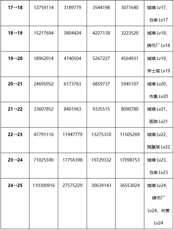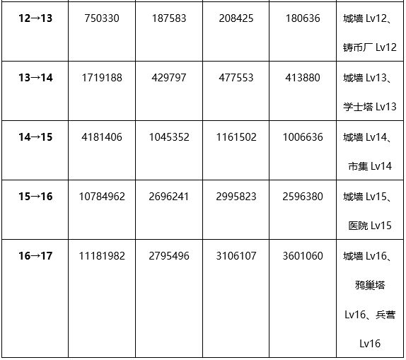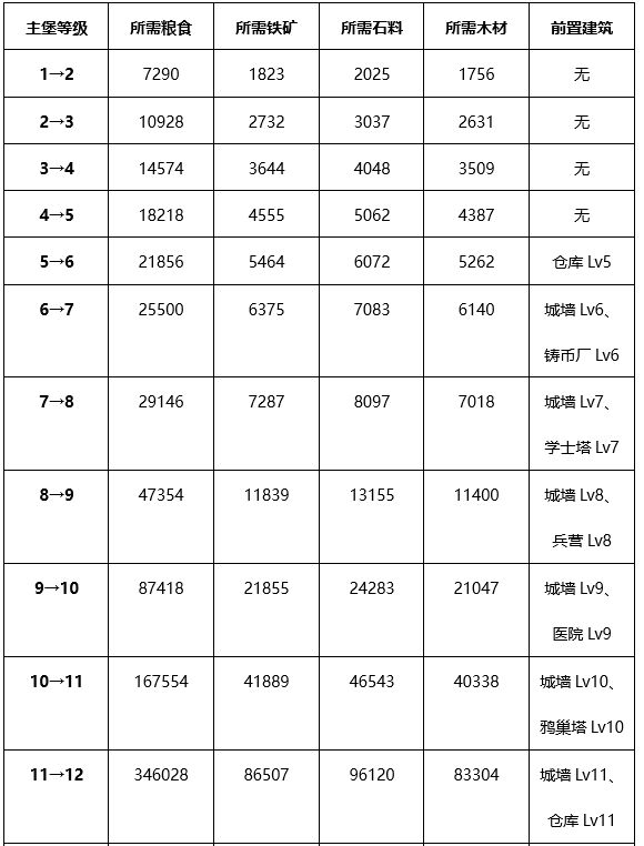 主堡每升一级都需要消耗一定的粮食、铁矿、石料与木材等资源,其提升至5级以上后,都还需一些前置建筑达到一定的等级主堡才可继续升级。且主堡所升等级越高,需要消耗的资源越多。