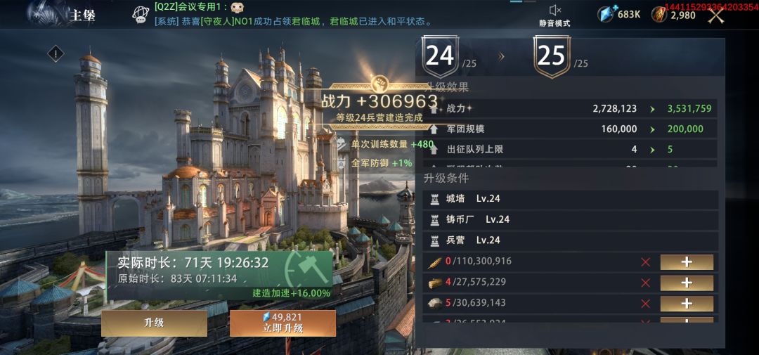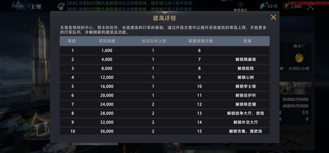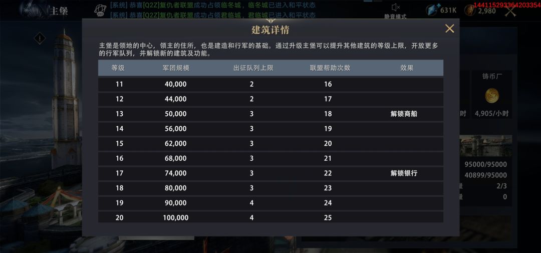 显然主堡等级越高,升级强化后军团规模、出征队列上限、联盟帮助次数等都会有相应提升。而这些都是我们实力强化的基础。如同等条件下,出征队列上限越高,我们可获取的资源等也会越多。