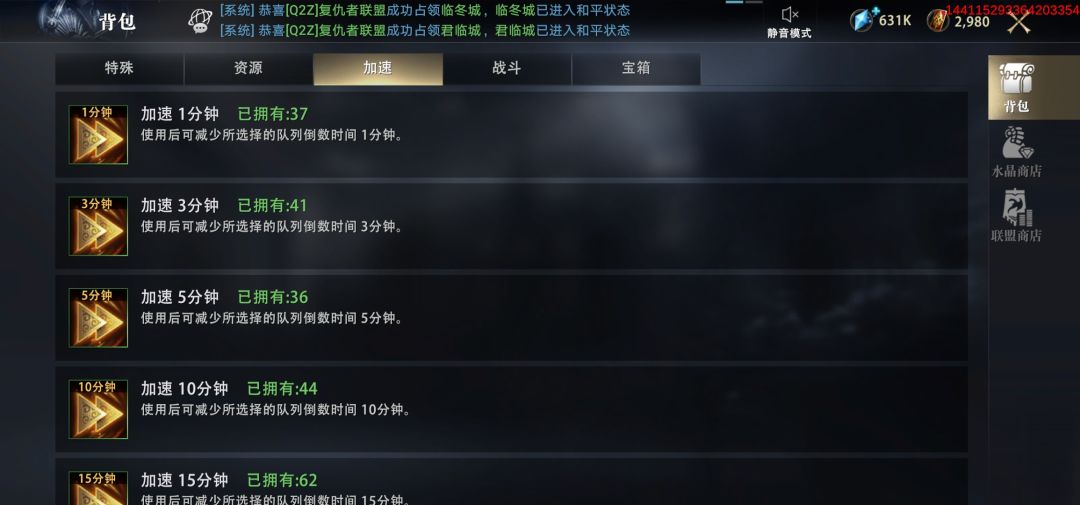 建筑的升级都需消耗一定的时间,到建筑升级的后期更是消耗时间量巨大。合理使用加速道具也能达到建筑更快升级的效果。加速道具可通过参与心树试炼、通关叛军营地、领取联盟福利等方式获得。