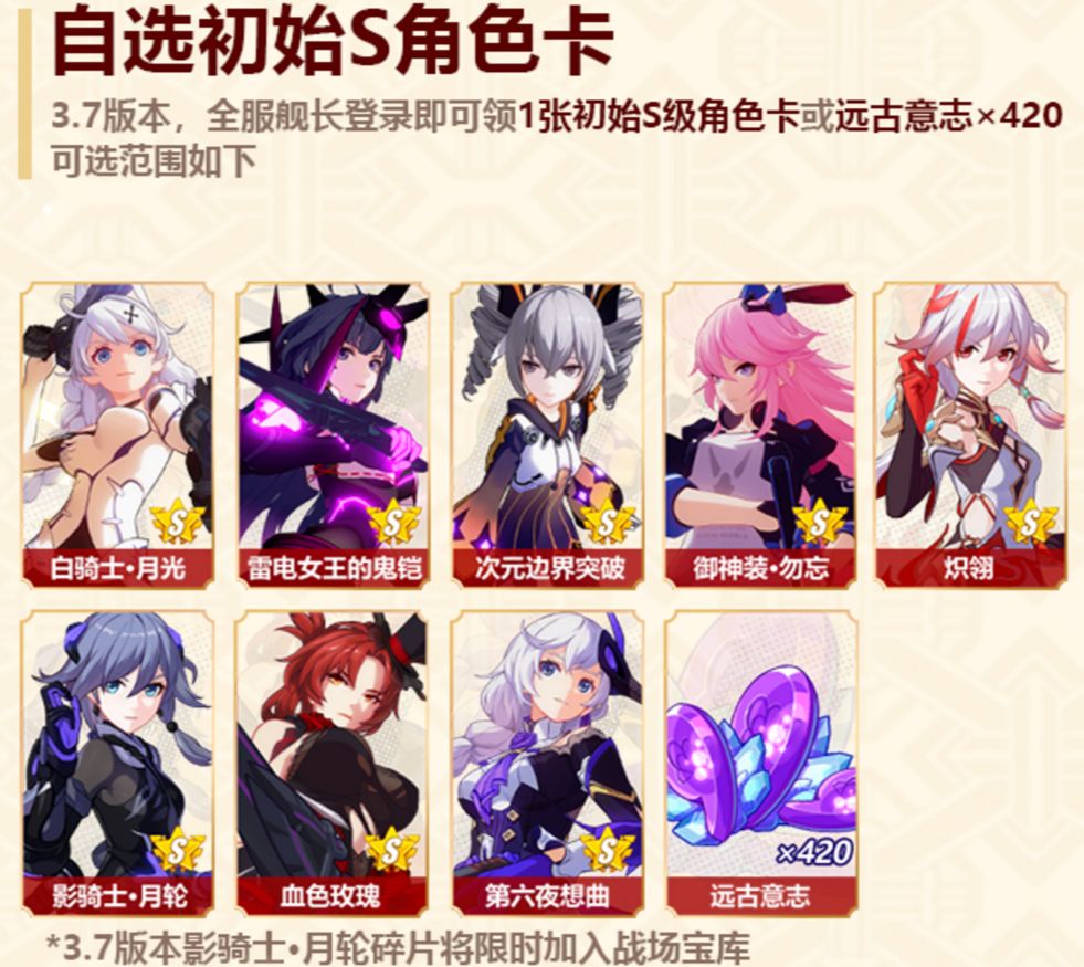 春节福利预告第一弹一一自选S女武神角色卡。(也可以选择等价的远古意志)