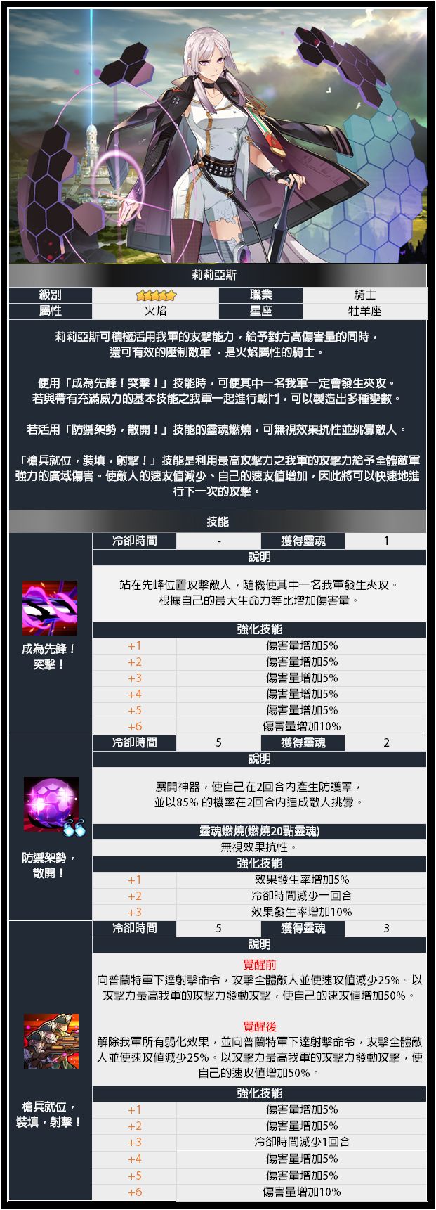 活用我军的攻击能力,给予对方高伤害量的同时,还可有效的压制敌军的火焰属性骑士「莉莉亚斯」!