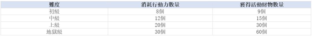 - 难度越高、消耗的行动力及获得的活动财物量也就越多。