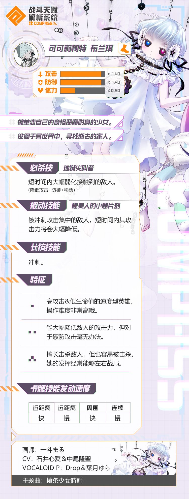 攻击倍率高,血量倍率低,属于高伤害但很脆的一个角色,上手难度较高,被动可以大幅度限制敌方输出职业的输出能力。