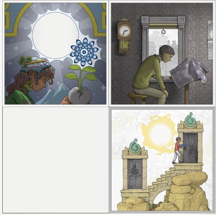 《Gorogoa》的玩法如同手绘的画面一样惊艳:通过在四个画框中将画面移动、放大缩小、合并与拼接来解开游戏中谜题,完成对剧情的推进。画面与画面的嵌套与分离,则有如一块块的拼图,在拼合的过程中完成场景的切换与时空的衔接。