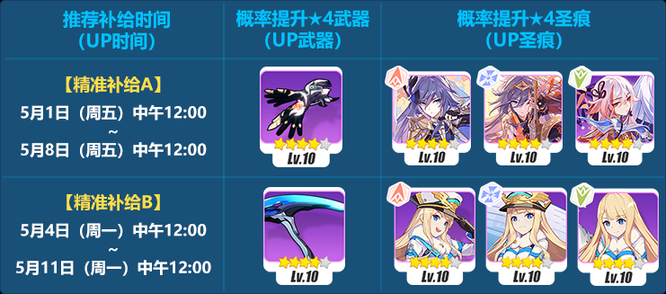 以下内容标紫的为本期精准补给A的UP装备,标蓝的为本期精准补给B的UP装备;标黄的为本期精准补给对应装备的超限形态。