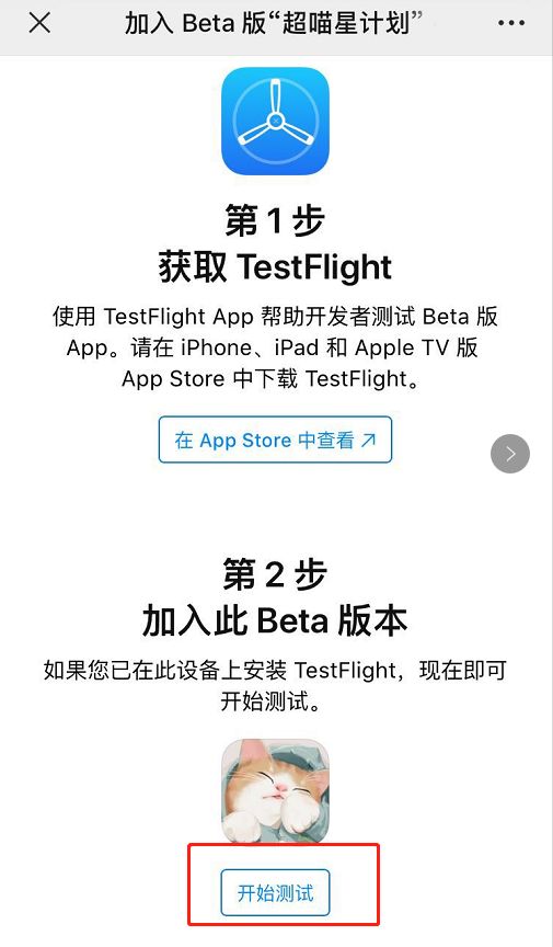 步骤三:点击弹出页面的“开始测试”按钮,跳转打开“TestFlight”软件