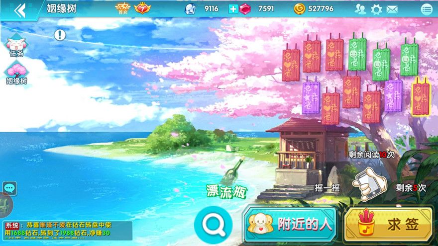 汇集着恋舞情缘的浪漫宝地“姻缘树”位于《舞之恋》主界面的左侧,进入姻缘树,桃花树下就是求签的庙宇,桃花纷飞,就仿佛进入到三生三世的十里桃林,这般浪漫场景,相信大家都想要找到心仪的另一半一同欣赏,在姻缘石上刻下你们的情缘故事。