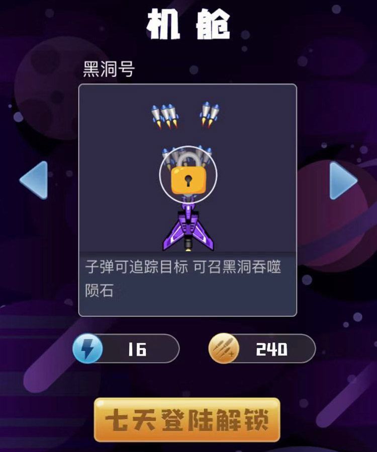 这款机型的亮点就在于它的子弹是带有追踪功能的,所以比较适合手残党。然后说一下它的技能,黑洞号的技能是释放一个黑洞在屏幕中上部分,值得说一下的是,只有在陨石落在黑洞范围内的时候才会被吸收,范围外是照常的。而且根据我自身体验,这个黑洞是有一定容量的,当玩家屏幕的陨石过多的时候黑洞可能不能完全吸收完。