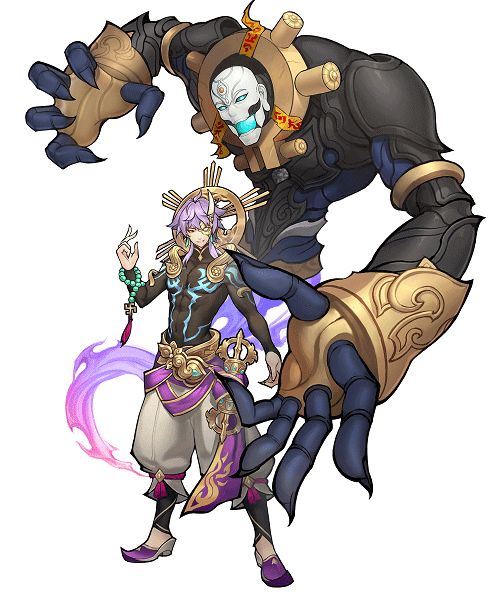 从佛家大成到反派的大转变,形象必然随之颠覆,但在颠覆之中也不无处不尽显着佛性。因此在最初的草稿之中地藏所着以金色为主,彰显神圣。但再考虑到地藏长期游离于地府且内心早已离经叛道,黑紫搭配更加符合形象需要。那么地藏是否就此失去了佛这一设定?细心的小伙伴一定发现在最终定稿地藏手中的金刚杵以及脑后的金圆环了吧,这些都是为其保留的象征物。