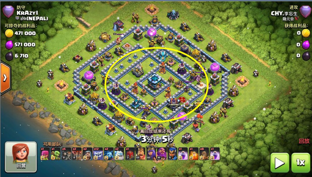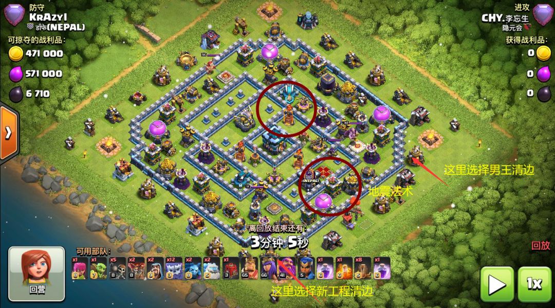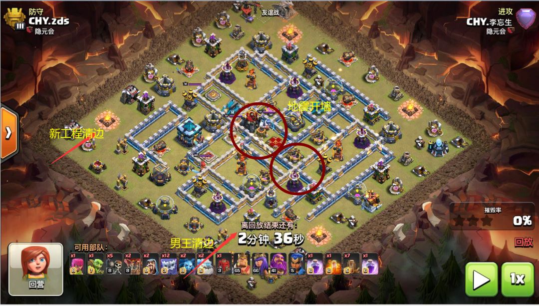 1.在阵型中选择城墙最为密集或者将核心建筑包裹住的两处城墙用地震打开。(简单可以理解为地震最合适的释放位置)这里要注意,8个地震可以开两波城墙,而两次开的墙切记要联通在一起,否则雪怪这个憨憨还是很容易砸墙。