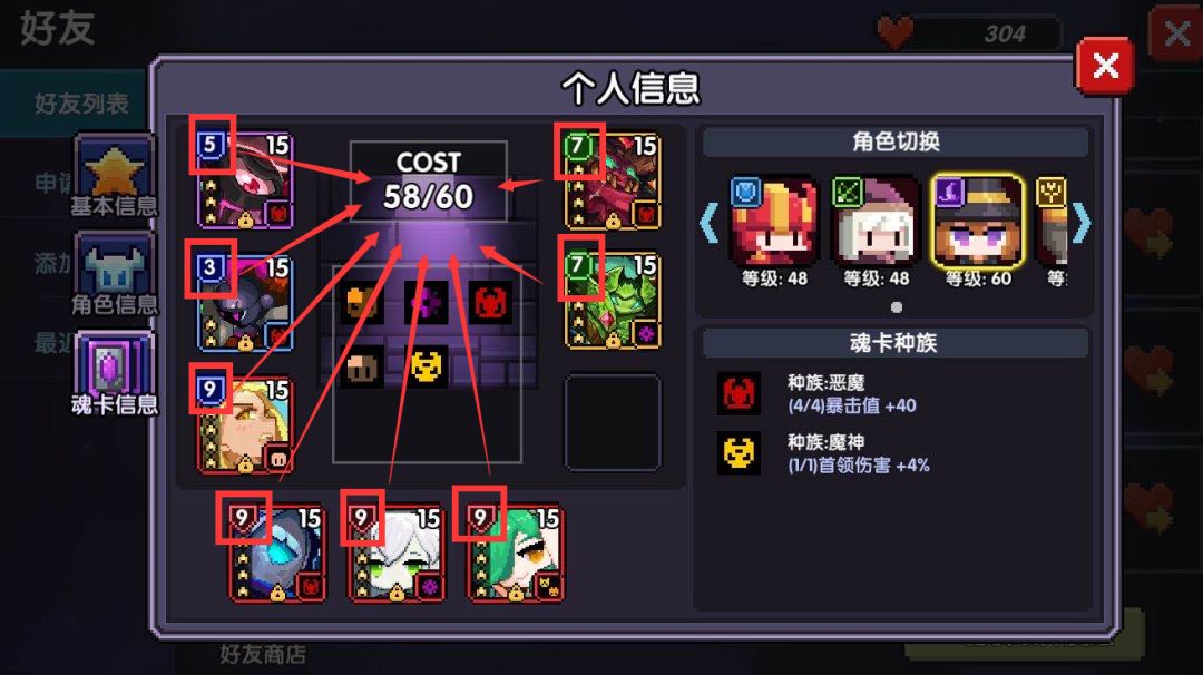 魂卡一共分武器卡、防具卡、饰品卡三种,有红、橙、紫、蓝、白五种品质,分别对应9、7、5、3、2点COST值,COST值=你的人物等级,简单来说,等级越高、COST值就越高,你就能装备越多的魂卡和更高品质的魂卡,装备魂卡左上角的数字之和不能超过当前COST值(如下图)