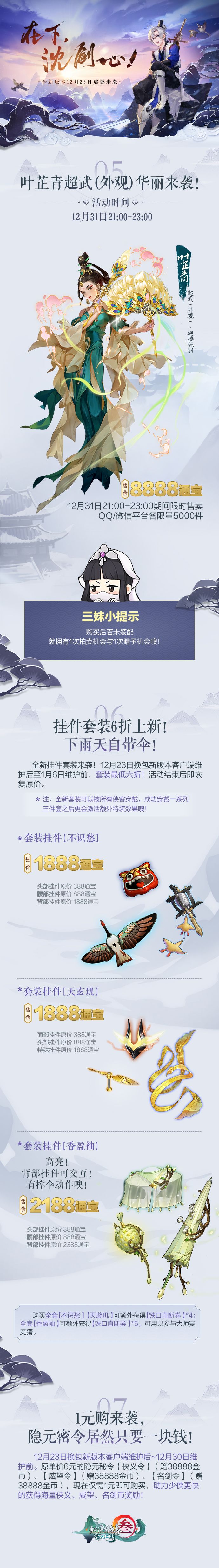 3、全新挂件套装6折上线!叶芷青超武(外观)年末开售!更有强力buff、1元购隐元密令助力少侠行走江湖!