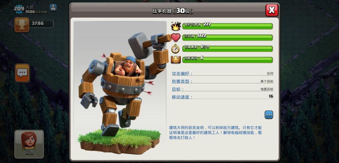 在夜世界草木丛生的野外,战争机器静静地躺在草丛中,点开它你可以看到描述:“在尝试举起当地最大的铁锤时,这台巨型机器出了故障。稍加修复,他便能投入战斗!” 如果首领们想要让这一庞然大物重获新生,只需夜世界达到五本并花费90万圣水就行。那修复后的战争机器威力有多大你知道吗?今天我们就一起来看看吧!
