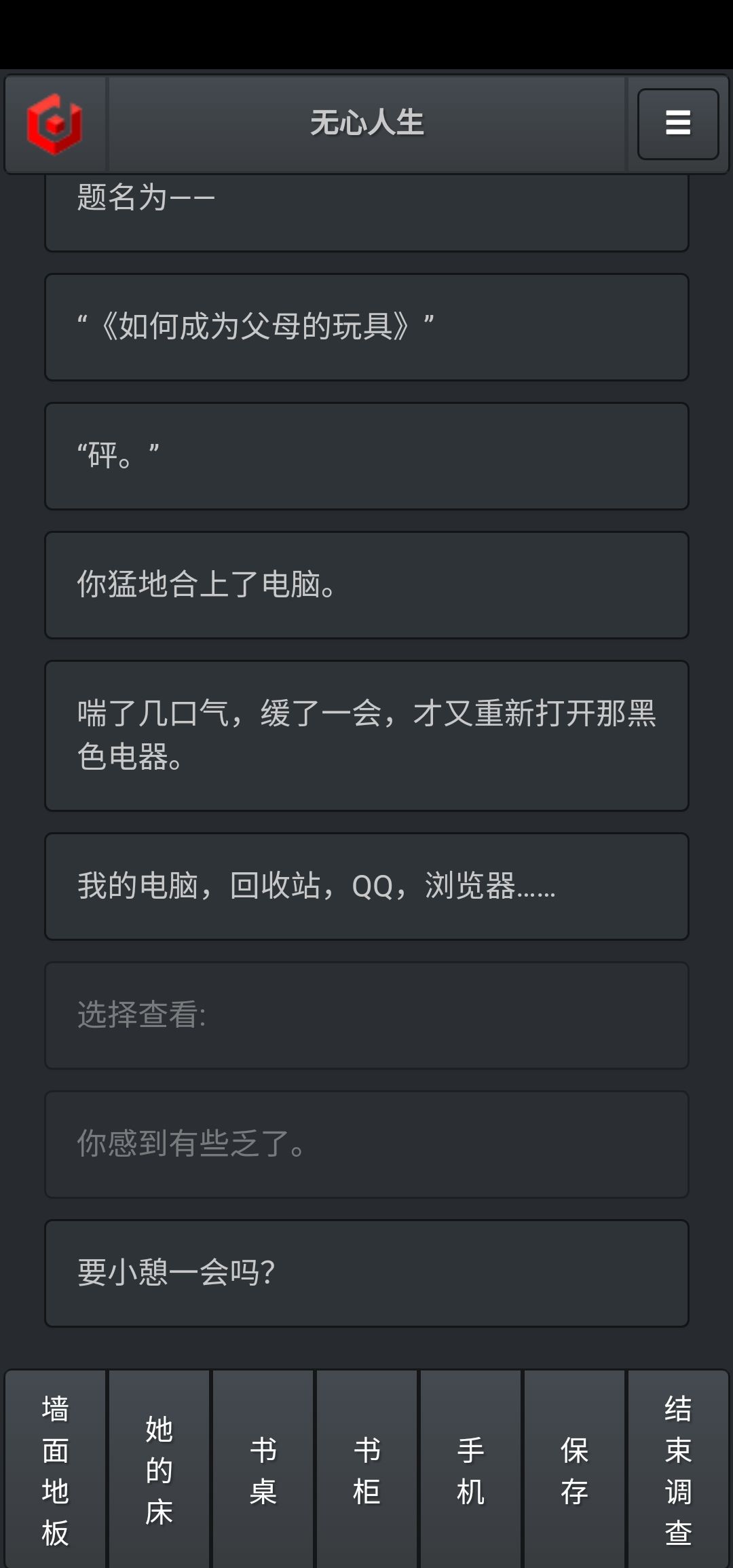 【我的通关过程是所有都点一遍,墙,床,书桌桌面和抽屉,抽屉中在数学试卷里的电脑内所有选项,全部都点,然后返回,此时游戏下面的选项有些改变,点击“她的床”,“要小憩一会吗”选择“要”,触发梦境】