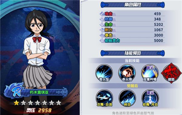 作为把一护变为死神的女主,在死神激斗中虽然最开始的露琪亚为R级角色,但是当升级到五星时会变为SR级角色,之前然怒后的技能也变为常态技能。