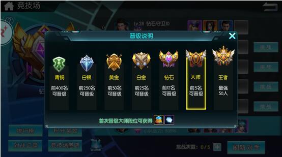 竞技场按实力和排名划分为青铜、白银、黄金、白金、钻石、大师和王者共七个段位。想要晋级证明自己,一定要在每个段位有一定的名气,无名小卒可没有资格晋升哦!最强王者全服只有50人哦,所以赶紧去占有一席之地吧!