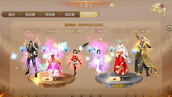 旌蔽日士争先,带长剑挟秦弓。《蜀门手游》本次3V3武道会的赛制分为四个阶段,玩家可自行组成战队参与到海选赛中,在一轮又一轮的交锋对战之中,当战队积分达到一百分时便可以从茫茫战队之中脱颖而出,成功晋级海选赛,进入下一轮的晋级赛比武当中!进入晋级赛的战队需要参赛三十场,且胜率排名在榜首前八,才可晋级到最终淘汰赛!更为严酷的淘汰赛执行三局两胜的规则,根据晋级赛时的排名,将会分配不同半区,并分配对阵表!玩家不仅可以观战淘汰赛还可参与武道会冠军竞猜,比赛结束后竞猜正确的玩家将平分奖池!而最后逐鹿武道会的赢得冠亚军的战队将会树立雕像,接受各路英雄的顶礼膜拜,功名盖世力挫群雄者当受此礼!