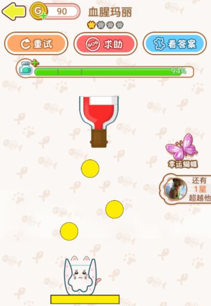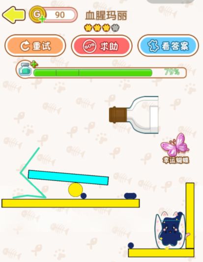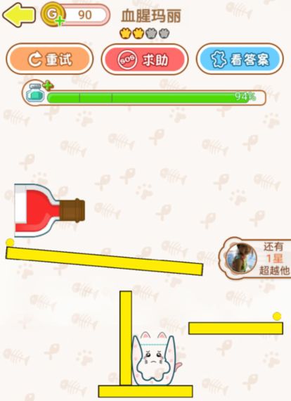 画出一个“5”字形的形状固定住一边,另一边会在重力的影响下和小球形成完美角度,把酒导进杯子里就可以过关啦。