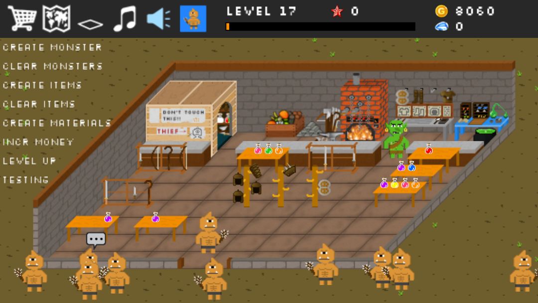 然后你的手下们成功杀掉怪物的话,会得到部份经验值和分赃(看当时有多少人一起攻击怪物而定)。手下们得到经验值后就会慢慢升级,然后依照各种不同的职业得到特殊进阶技能,最多可以得到三种,不过是固定的。但有可能你的手下不成材,杀人不成,反而被怪物砍死。那你就只好重新再花钱雇用一个新的等级一的手下,重新开始养。有钱的话,你就可以盖道具店或铁匠场,让你的手下们自己去消费购买武器或装备或药水,才比较不容易被怪物砍死。然后你可以派查税员去跟这些店家收取一部份的税金,以增加国库。阿这个游戏,是没有结局的,就看你能撑多久这样,所以比较像是生存模拟游戏。玩法大概就是这样… 所以你会发现,哥布林的道具屋裡,有很多它的影子。
