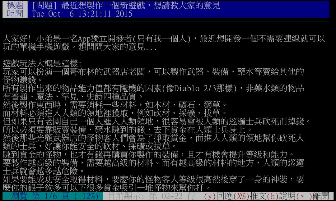 这个游戏的点子,大概是2015年10月左右,有一天在洗澡(or 上大号 or 有人托梦给我? 忘了… XD)时乱想想到的。当时,游戏的基本玩法,大概都差不多想好了。然后我有在论坛上先贴文,询问版上网友的意见。基本上游戏的设计方向,那时候就已经差不多确定了。
