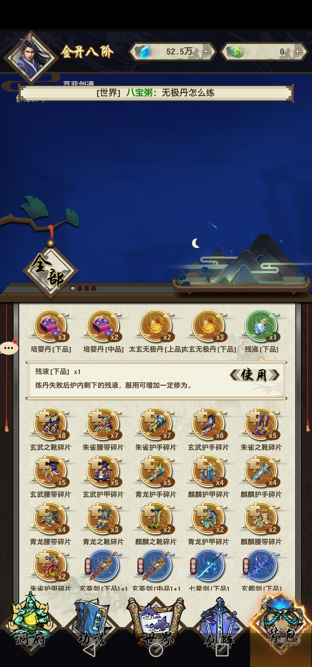 单方:人参果,千年人参,地藏花,百灵子,仙灵草赤朱果。练了6次两次上品,三次下品,一次残液。