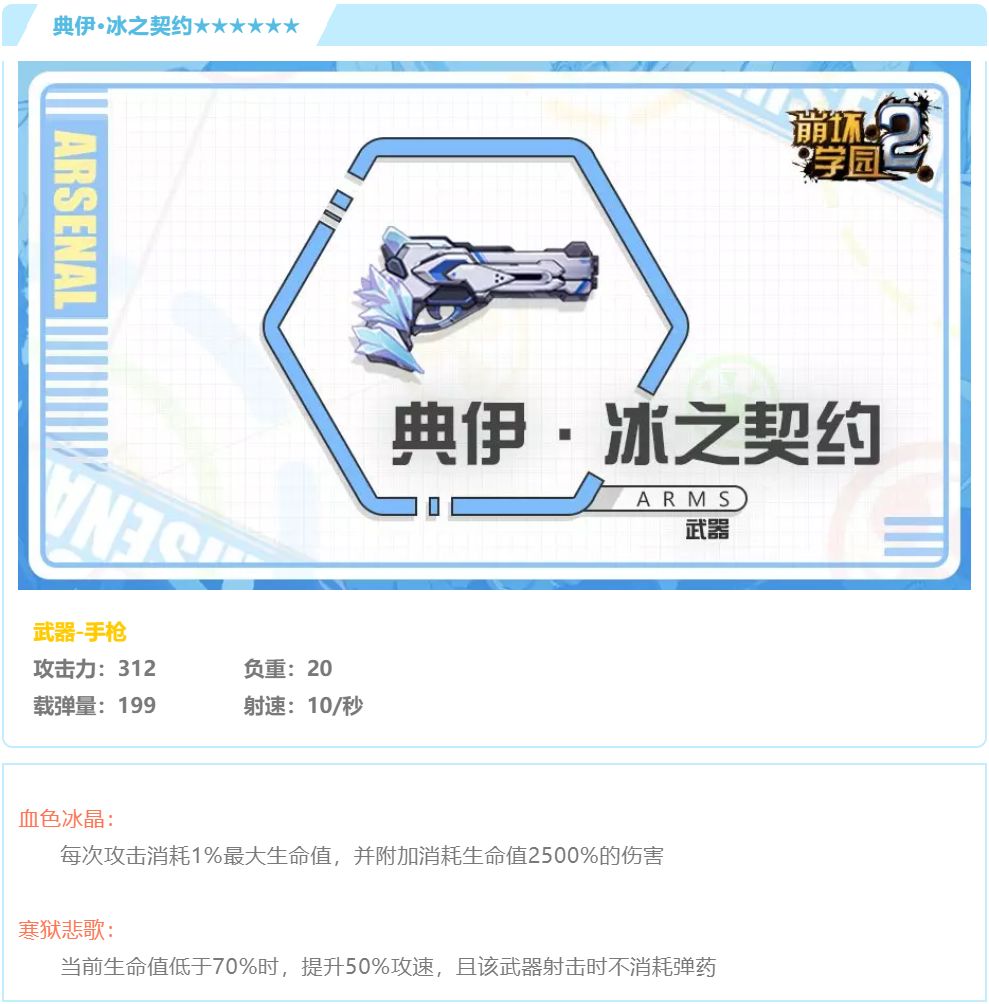 生命值低于70%时提升50%攻速,虽然射击时不消耗弹药但是血色冰晶的消耗最大生命值还是生效的,攻速提升后耗血的速度就更快了,务必搭配一些有回复效果的装备一起使用。