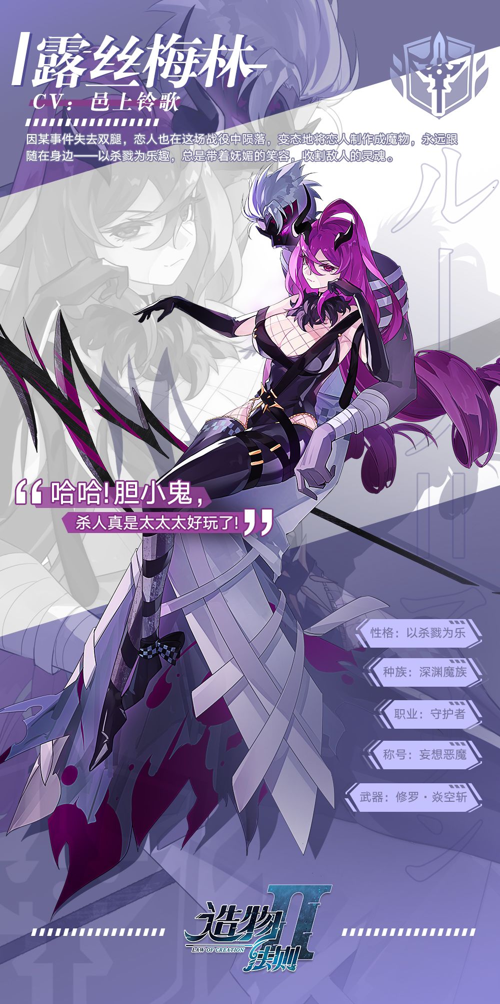 因某事件失去双腿,恋人也在这场战役中陨落,居然变态地将恋人制作成魔物,永远跟随在身边——从此以杀戮为乐趣,总是带着妩媚的笑容,收割敌人的灵魂。