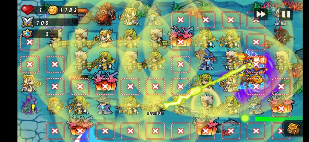 开局设置路线如图,将灵能法师放在地图中间,技能选择增幅类。前期其他站位可以放一些输出单位,加快游戏进程,这样基本无脑放置过到30-50关(差值来自不同玩家其他输出单位的强弱)。等灵能法师升级到50-60级(氪金玩家可根据氪度将等级后移,已达到更远关卡数)左右的时候,将它觉醒,这里选择等级*2的觉醒人物(觉醒后法师等级达到100+),其余站位放先知增幅,外围祭司和萨满补位,全图外加4个大法师,理想状态100关无难度。这里我是因为有点累了,强制退出的,如果一直玩预计115关左右达到我的极限(大佬们估计得150以后了)。