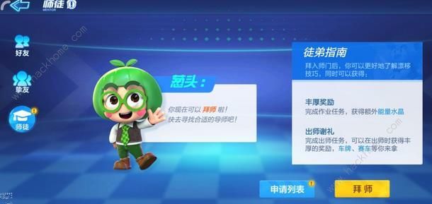 跑跑卡丁车官方竞速版中,在熟悉游戏后即可进入社交-师徒界面。通过申请来拜师或者收徒。打开申请列表里面会有意愿的玩家,点击即可拜师收徒,并自动加为好友。