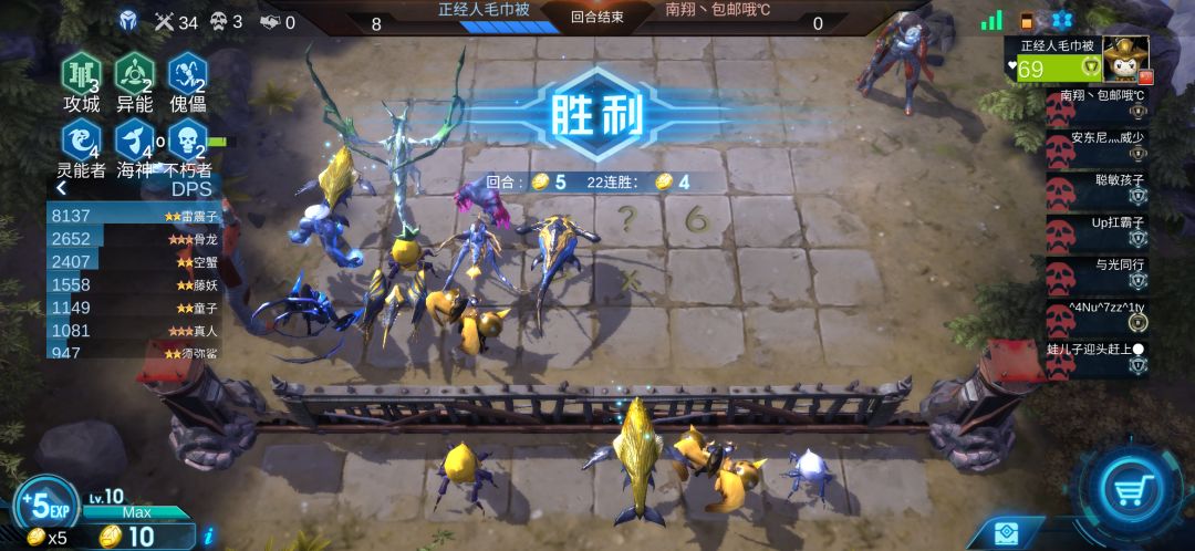 能狗到现在,恭喜指挥官,基本就是舒舒服服理财了,9人口是一个关键点,由于升10花费比较高,但我们后期是强势期所以一般不缺经济再加上连胜奖励很容易就滚起利息,由于利息机制是卡10+1且5金封顶,所以可以金币卡9金(个人回合结束胜利+1到10)或10金,有钱的可以保持50金币拿在手上吃利息刷起兵就会很舒服,不心疼吼吼吼,一般经验在9级第一个5就可以升10人口,这个阵容对完整性要求很高,具体还是看实战情况。然后就基本躺着玩了,阵容完整了任务就是升星,优先级童子最低其次是天师、真人其他看脸怎么刷怎么拿吧