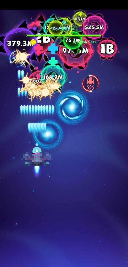 第二阶段:粒子球与病毒一起向前方快速飞行一段时间,途中会吸引病毒,当病毒碰撞到指定范围时(备注,此时被吸引的到粒子球中心的病毒与粒子球视为一个整体,若在飞行过程中碰撞到其他的病毒,将将携带这些病毒一起向前飞行),病毒会被吸引住发生爆炸,病毒四散开来且收到伤害。