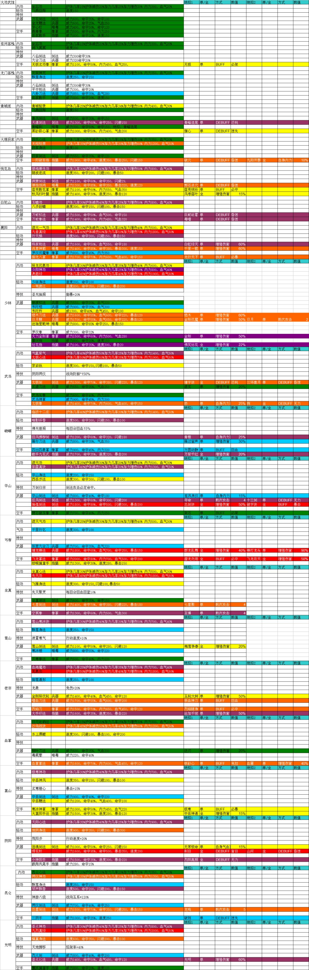 刚才大致的看了现存的攻略,大都是介绍很基本的新手入门和日常任务之类的。我想重要提示一下新人功法的选择,因为入门以后第一个指引任务就是让新手去藏经阁学习一门轻功,记住了,千万不要学,千万不要学,千万不要学。因为,你有比藏经阁初始轻功更好的!更好的!先去加游戏扣扣群!然后找接待小姐拿到畅玩码以后再去学黄色的轻功,因为猪脚六十级才能转世重修,没有重修之前只有五个技能可以学习!所以学习技能一定要慎重考虑!下边我附送游戏内每个门派可以学到的各种武功供大家参考!最好自己先按照自己的预想有针对性的去做门派任务,因为友好度很难获取,所以大家要有个打算有针对性的去刷友好度任务!下边的文件因为图片的原因需要大家放大了看,内容太多字体只能做的很小,有些抱歉了!
