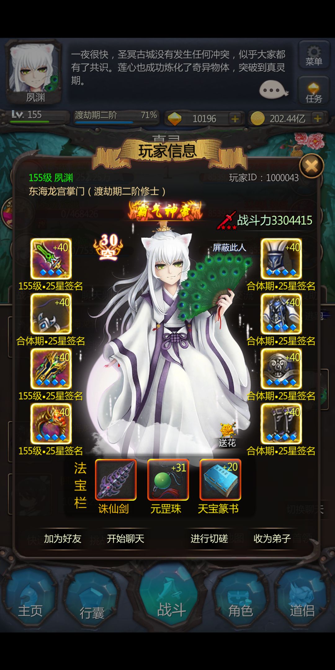 这时你已经基本熟悉了这个游戏,等级也应该有100级左右了。这时候,大致的还是和往常一样,不过要学习一些进阶玩法了。这时可以选择龙宫、人教、九窟这几个门派,挑战、打野、禁地、天机、禁法、援助都要做完,洞府永远挂修为,在升级的同时,境界也不要落下。每天不要留一点东西,不要放过一丁点可以让你变强的机会。资源这时也有了一些,不要太浪费。装备淬炼到20就不要继续了。进化归劫洗髓给主力输出道侣,最终是要把她培养到18阶的,副道侣最多7阶,不要浪费太多资源。金母混元继续升星,资源最重要,为了加成。升到10星就暂时不要再继续,换另一个升,可以早点吃到更多收益。这时你要牢记,千万不要浪费资源。记住一句话,你每使用资源之前,都要先考虑一下,能给你带来什么提升?你能做什么?如果毫无作用,那为什么要使用呢,攒着等待关键的时候,能派上大用场。提示一点,洞府你需要一直挂着修为,好为以后做准备。