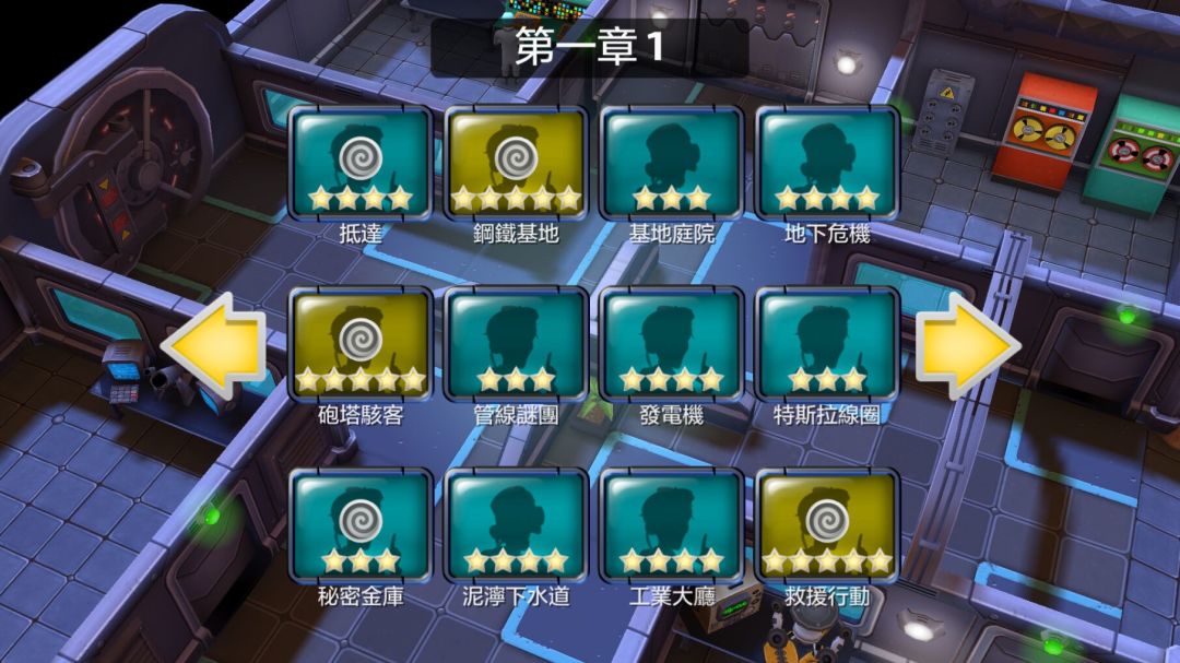 第一章1:抵达、钢铁基地、基地庭院、地下危机、炮塔黑客、管线谜团、发电机、特斯拉线圈、秘密金库、泥泞下水道、工业大厅、救援行动。