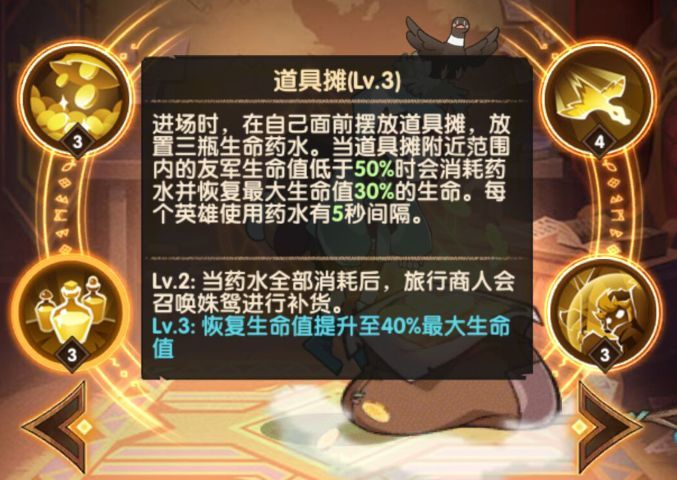 进场时面前摆放道具摊,上面有三瓶生命药水,当周围友军生命低于50%时会喝掉,恢复40%的生命,有5秒间隔。都喝完后,还会迅速补货。全游戏最有创意的技能没有之一,俗称手推车,富二代商人的招牌技能,比大招战略价值还高,因为即使罗万死了这个车还在。而罗万的专属武器还会给车上额外增加一个蓝瓶,当友军达到600能量时,会立即喝下蓝瓶,达到满能量,直接释放大招,这使罗万的战略地位达到最高,能快速开大,谁不爱富二代小帅哥。