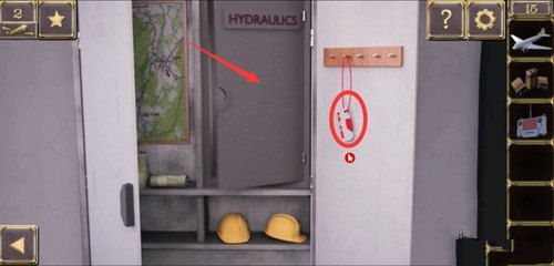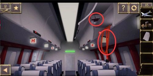 点击A上面的行李架,点击箱子输入密码FLHRA,得到飞机模型和电池;