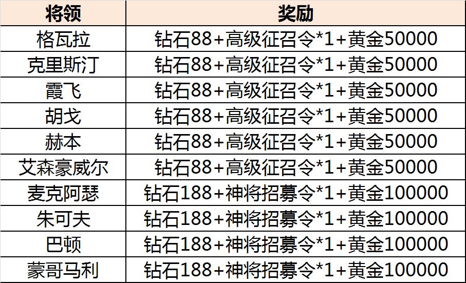 招募到特定将领可以最高领取1280钻石,神将等你抽取!