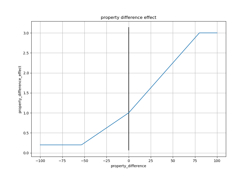 属性差作用项,描述了属性差的作用。当攻击方属性高时,它等于1+ 0.025×(攻击方属性–防守方属性),有上限3。当攻击方属性低时,它等于1+ 0.015×(攻击方属性–防守方属性),有下限0.2。该项值与属性差的函数关系如下图: