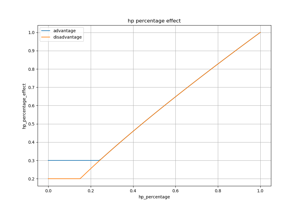血量百分比作用项,描述了血量百分比的作用。它等于攻击方(现在血量/最大血量)^0.85,当攻击方属性高于防守方属性时,它有下限0.3,当攻击方属性抵御防守方属性时,它有下限0.2。该项值与血量百分比的函数关系如下图: