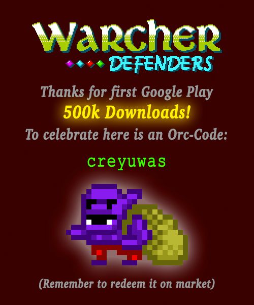 Hey! We are Ogre Pixel, the developers behind Warcher Defenders! As we have already broken the 250k and 500k downloads on google play we decided to share 2 Orc Codes! Here they are =)