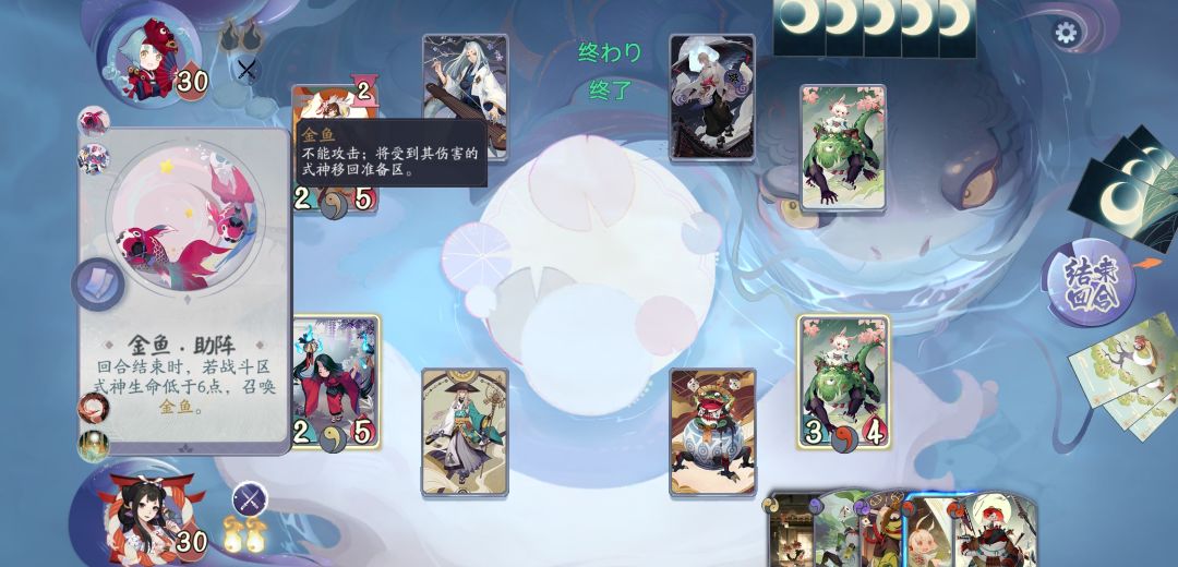 后期我方式神达到可以秒掉金鱼的伤害时,可以直接拿去和对面的式神贴贴,直接解掉对面站场式神或者对面自己上来送,有不屈的先触发掉不屈效果,不然和回满血的效果会叠加