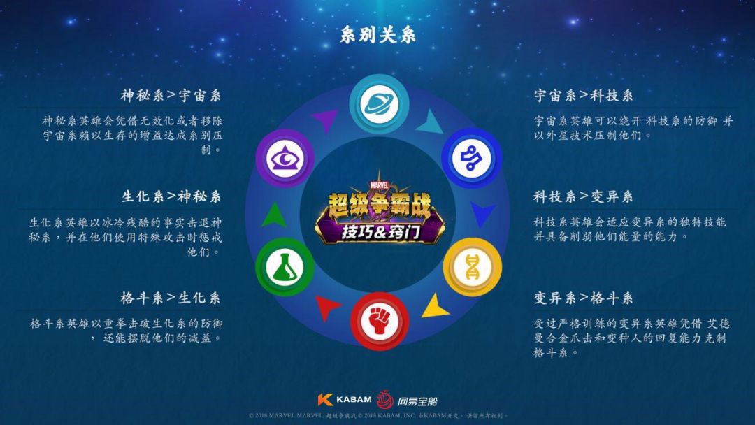 其实克制关系很容易理解,科技系英雄很难适应宇宙系的外星科技,但对于消除变异系英雄的变异能量却是一把好手。而格斗系英雄却对变异英雄的再生能力束手无策,生化系科学正在捣鼓实验时就被格斗系先发制人。低防御的神秘系英雄难以承受生化系生化炸弹的一击之威,但对于神秘不着边际的宇宙系英雄,神秘系英雄却能轻松让他们的增益无效化。在游戏中玩家能很清楚的通过图标区分这六个系别:拳头——格斗系、星球——宇宙系、药瓶——生化系、DNA——变异系、金字塔——神秘系、线路——宇宙系。