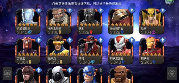 因为《漫威:超级争霸战》中英雄繁多,这里就不对其进行一一介绍了,简单的推荐几个有特色的超级英雄。变种人推荐凤凰女、和。普通人推荐金刚狼、美国队长、黑豹。变异人推荐小虫、电光人还有各色浩克也不错。但是各色浩克尽量不要主修因为后期能力不算特别优秀,同理即使是最强的绿巨人浩克也不推荐玩家作为本命英雄。