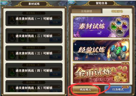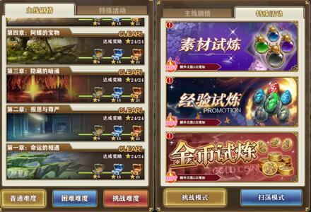 在26级之前,主要打主线(普通,困难,挑战)和开了的试炼本(素材,经验,金币好像还没开。本游除了主线,其他所有东西都在特殊活动页面,进入方式是主线》特殊活动,往下拉 或 试炼,往下拉。注意,是挑战模式)来升级,注意试炼本没卡关时就只打一遍,这样不消耗次数。