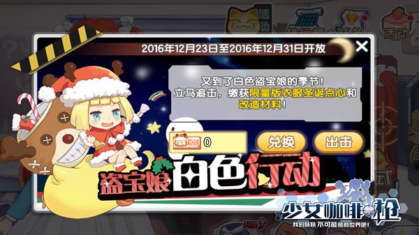 这次的作战行动由16个挑战关卡和4个剧情关卡组成,且可恶的盗宝娘十分狡猾,竟变出了大量分身进行犯罪活动,在活动期间内击倒指定数量的盗宝娘分身,获得活动期间代币来兑换圣诞限定衣服及其他奖品,据说此次的装备超级豪华哦!不仅有各种武器升级材料,更有只有海外还在少量流通的“圣诞点心”服装,并配有圣诞限定头像挂件!错过这一次,多等一整年!