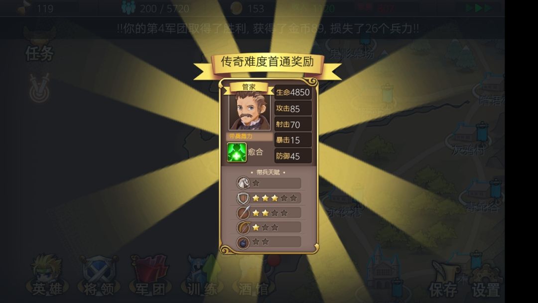 然后用将军去打会更快,注意传奇模式记得补将军因为会战死,当获得军位时记得补将军和部队